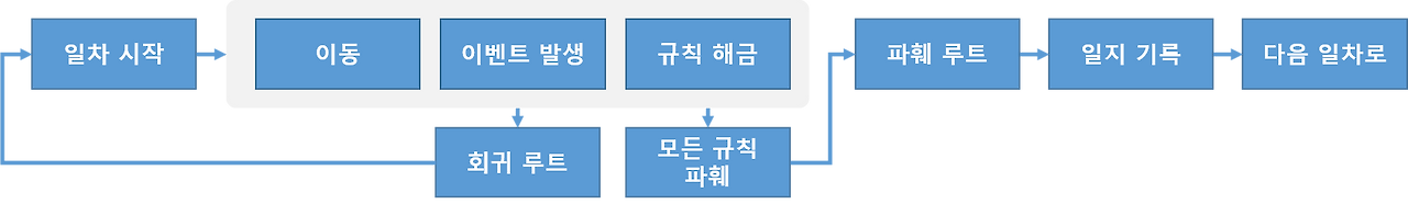 → 규칙을 지키면 생존 (2일 차로 넘어감) ❎ / 어기면 회귀 (1일 차로 돌아감) ✅